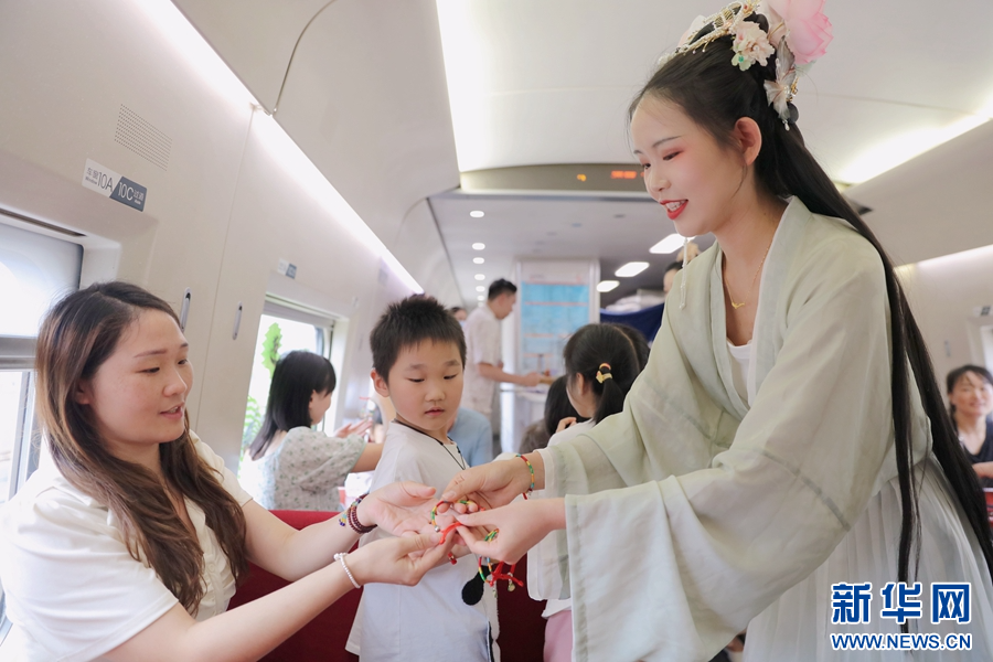 “端午临中夏,时清日复长。”“粽包分两髻,艾束著危冠。”“彩线轻缠红玉臂,小符斜挂绿云鬟……”6月20日,大理开往重庆西的G2850次列车上,一场流动的端午“诗词大会”拉开帷幕,中国铁路昆明局集团有限公司昆明客运段的乘务员们身穿汉服,以诗词为开端,向旅客们介绍端午佳节的来历及相关习俗,并开展了诗词互动问答、端午香包制作、五彩绳编织等互动活动,为旅客们营造浓厚的节庆氛围、送上美好的节日祝福。