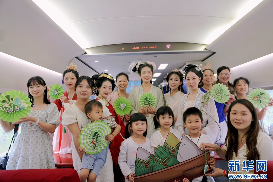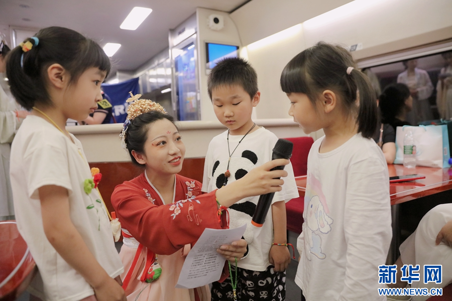 身着汉服的乘务员邀请小乘客们参与端午知识问答(摄于6月20日)。新华网发(杨紫轩 摄)