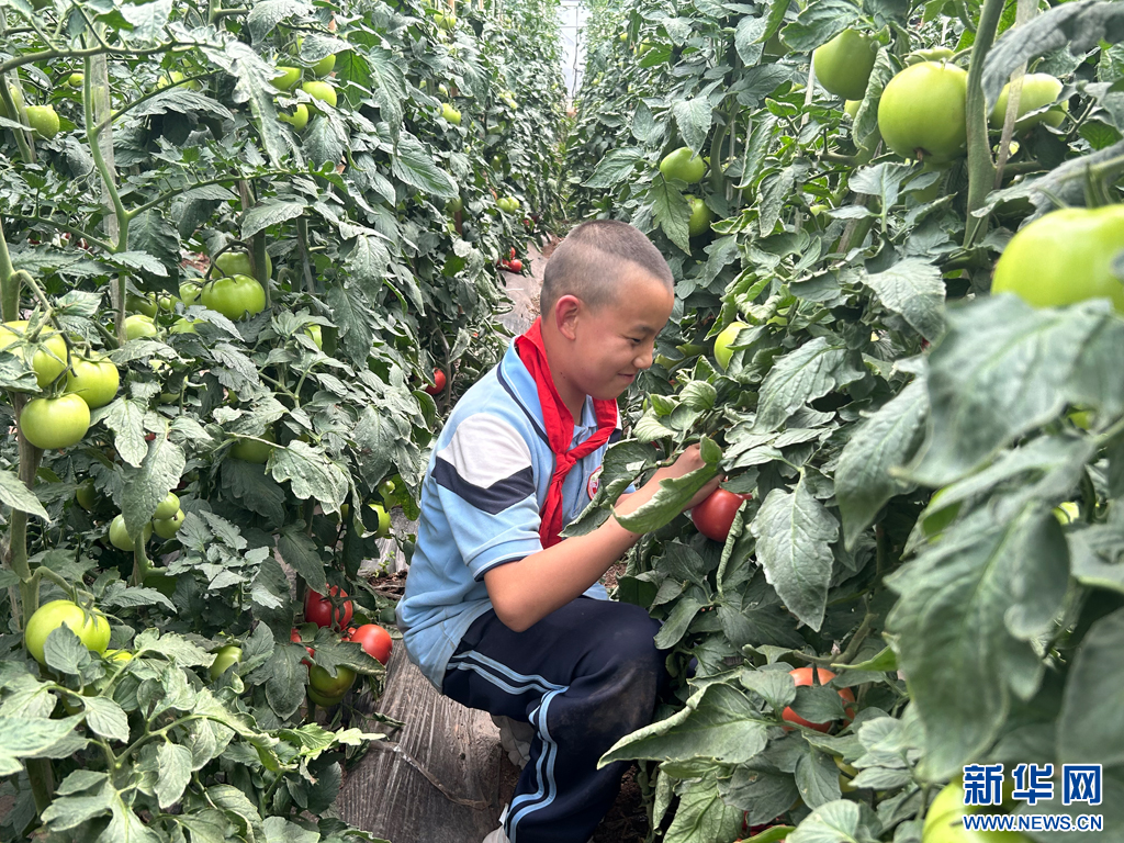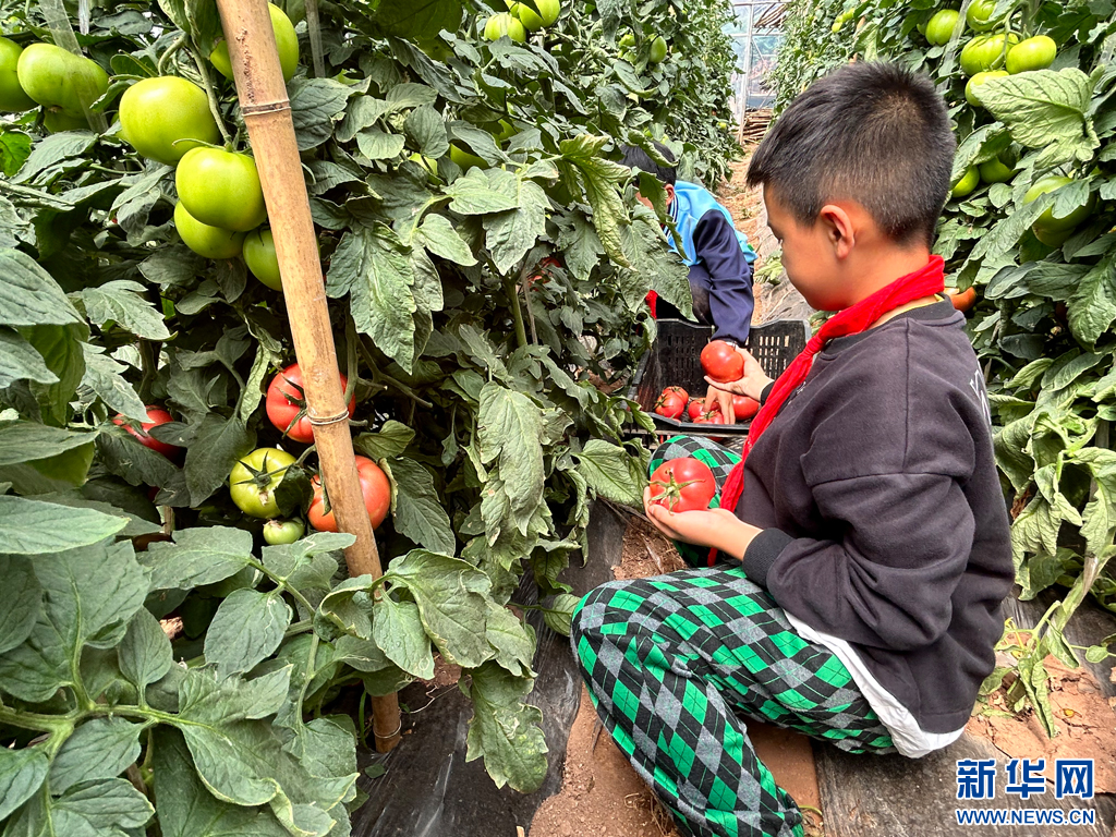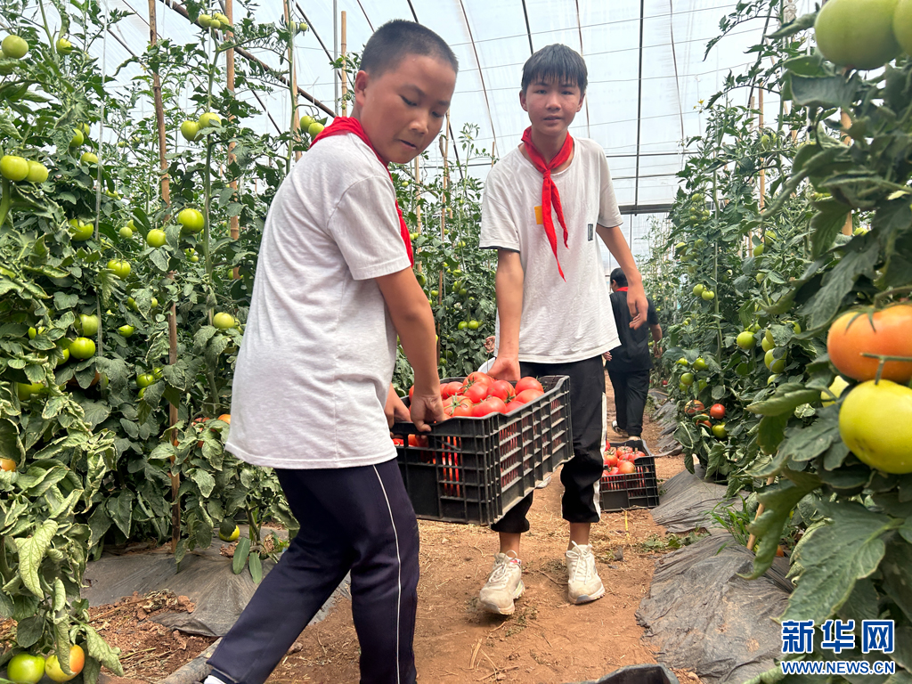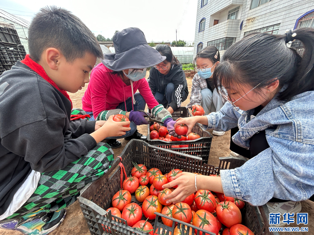 忙于采摘西红柿的学生们。新华网发(安宁市教育体育局 供图)