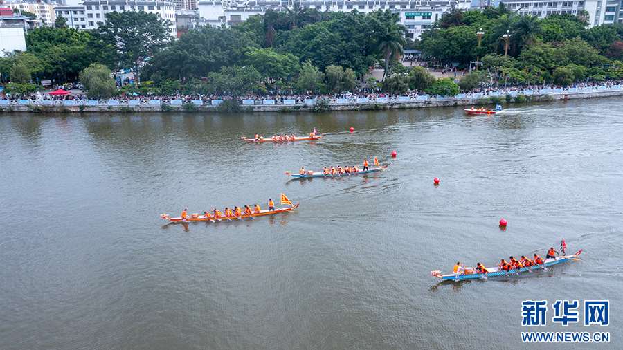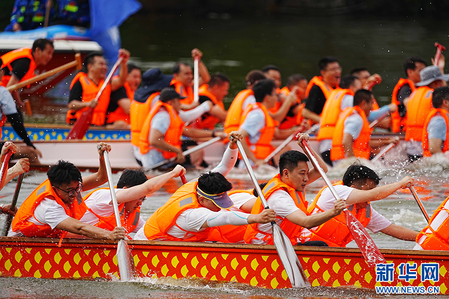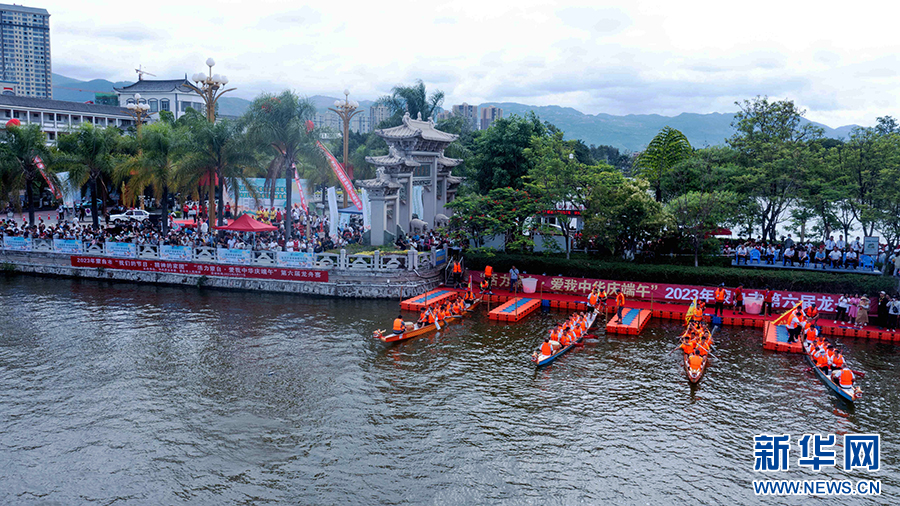 6月21日,云南省红河哈尼族彝族自治州蒙自市举行端午龙舟赛。骄阳下,碧浪中,队员们鼓声不绝、号子激昂、热情高涨,整齐划一的动作溅起层层水花。(蒙自市融媒体中心)