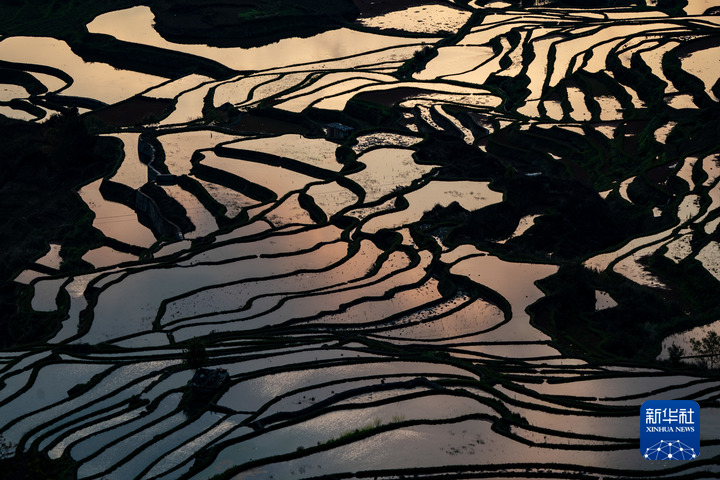 2022年1月3日,地处云南省红河哈尼族彝族自治州元阳县的哈尼梯田蓄水充盈,在阳光的照射下色彩丰富,美不胜收。新华社发(甘与汇摄)
