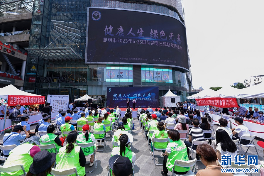 26日,昆明市禁毒委员会办公室联合盘龙区禁毒委员会办公室开展以“健康人生,绿色无毒”为主题的2023年“6·26”国际禁毒日现场宣传活动。
