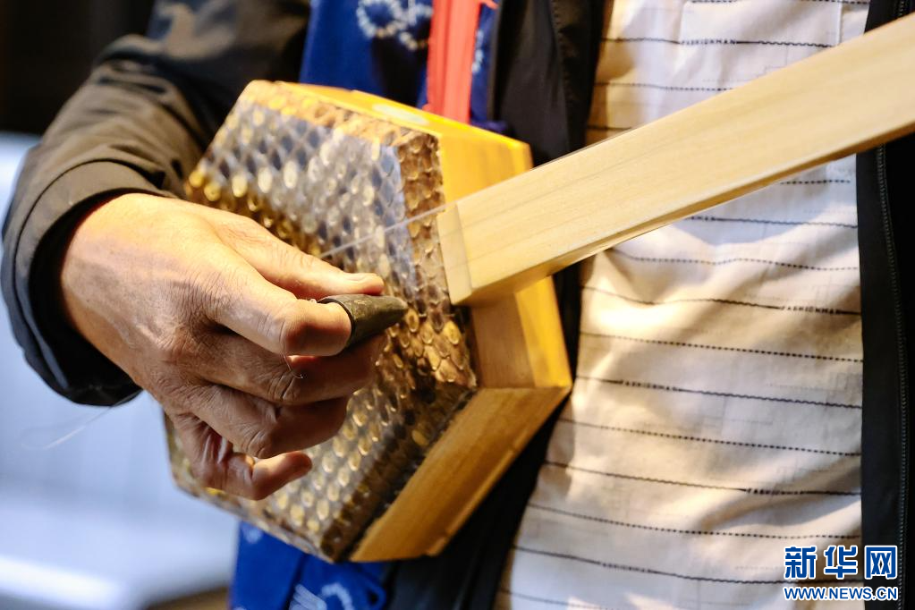 一人弹三弦伴奏(6月14日摄)。新华网发 (胡妤雅摄)