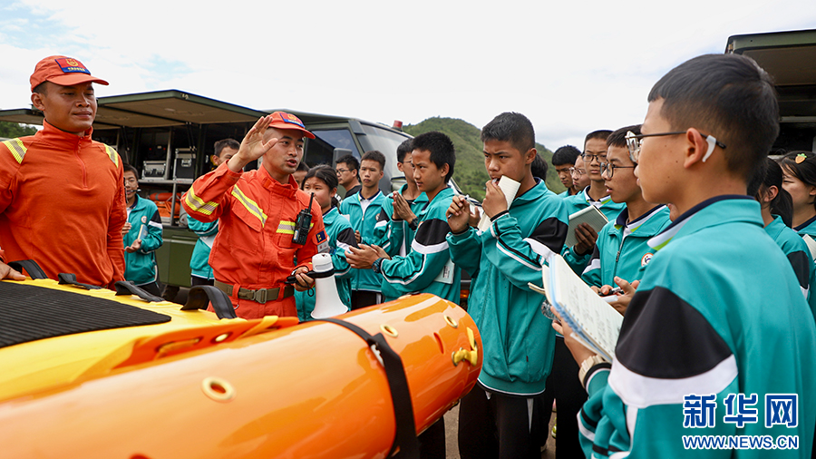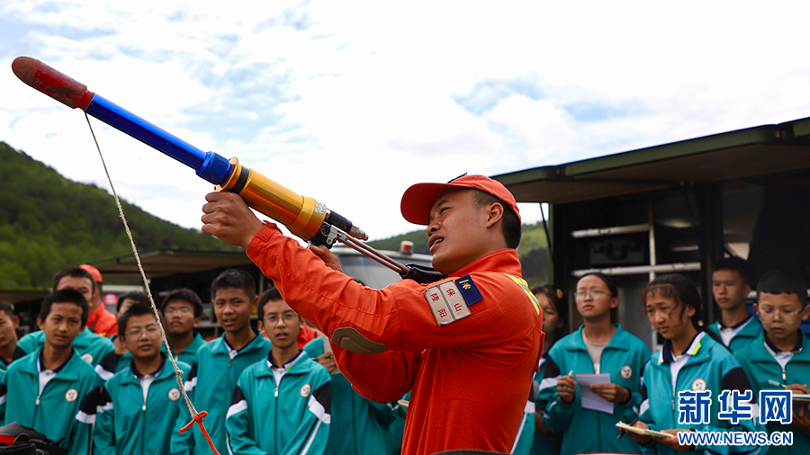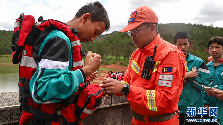 森林消防员向学生们展示水域救援装备(摄于6月29日)。新华网发(云南省森林消防总队保山支队供图)