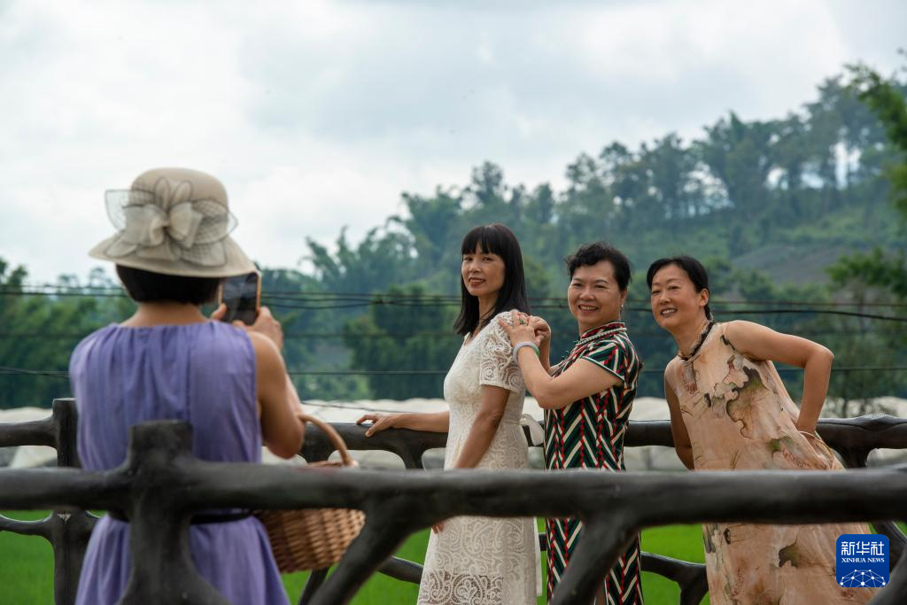 7月14日,游客在云南省德宏傣族景颇族自治州芒市风平镇帕底村介桃村民小组参观拍照。