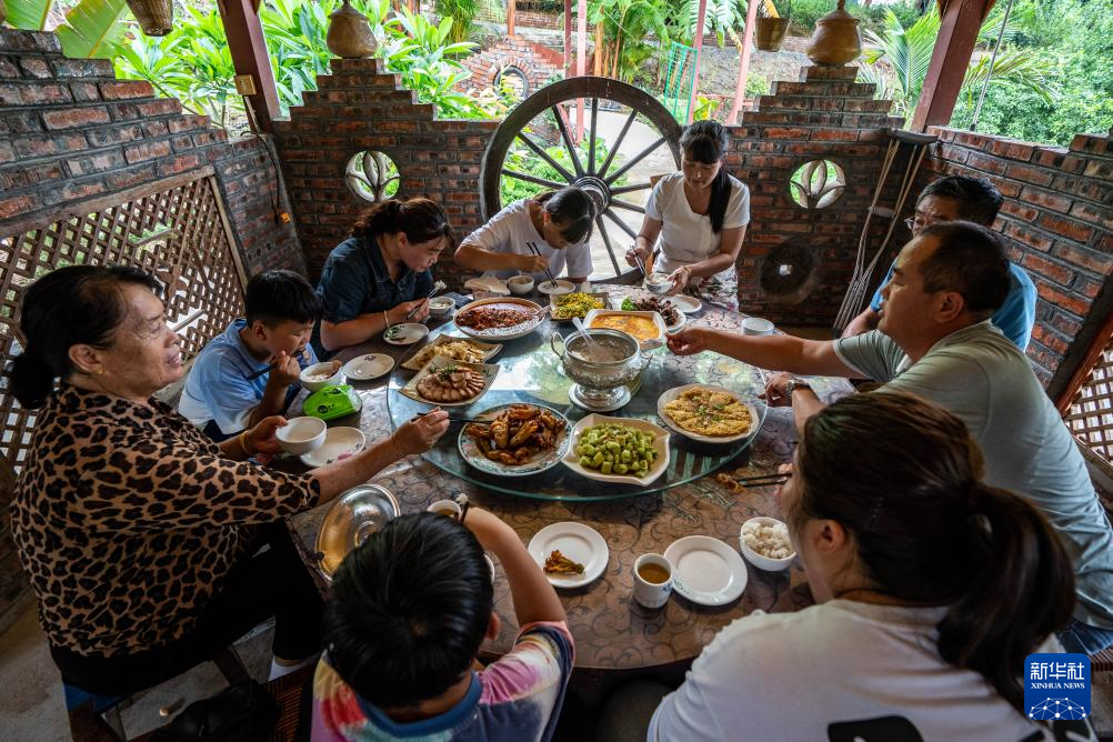 7月14日,在云南省德宏傣族景颇族自治州芒市风平镇帕底村介桃村民小组,来自安徽的游客在农家乐里吃午饭。