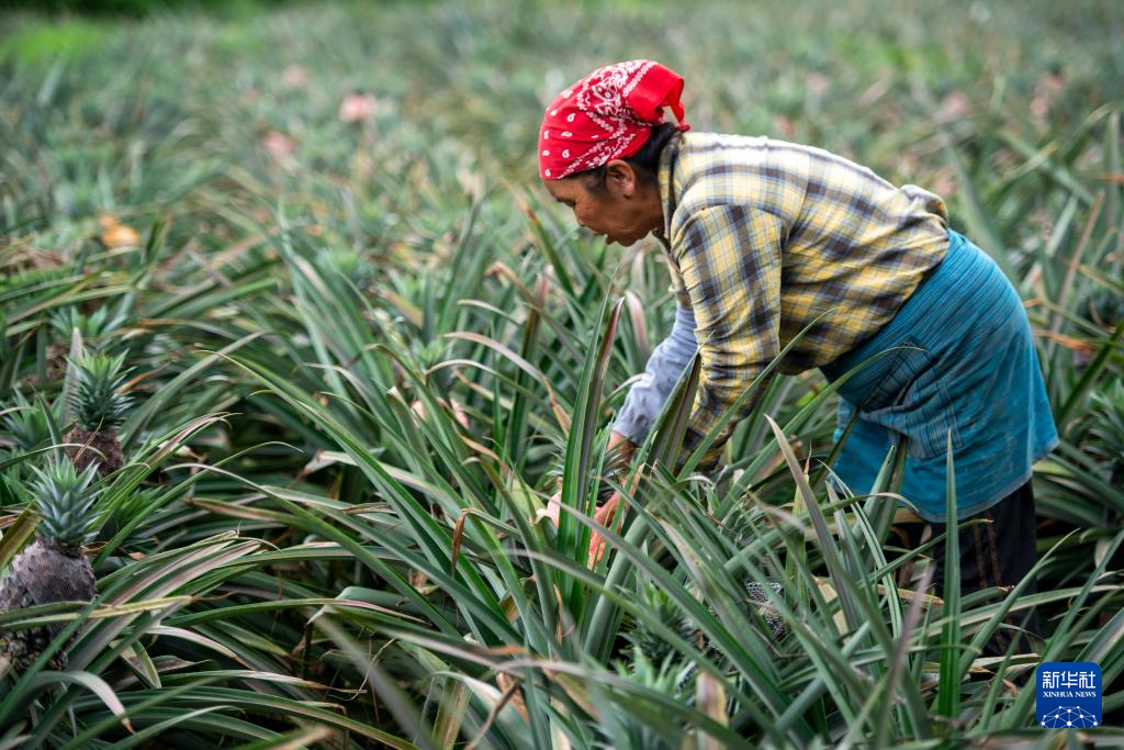 7月14日,在云南省德宏傣族景颇族自治州芒市风平镇帕底村介桃村民小组,一名村民在菠萝地里干农活。