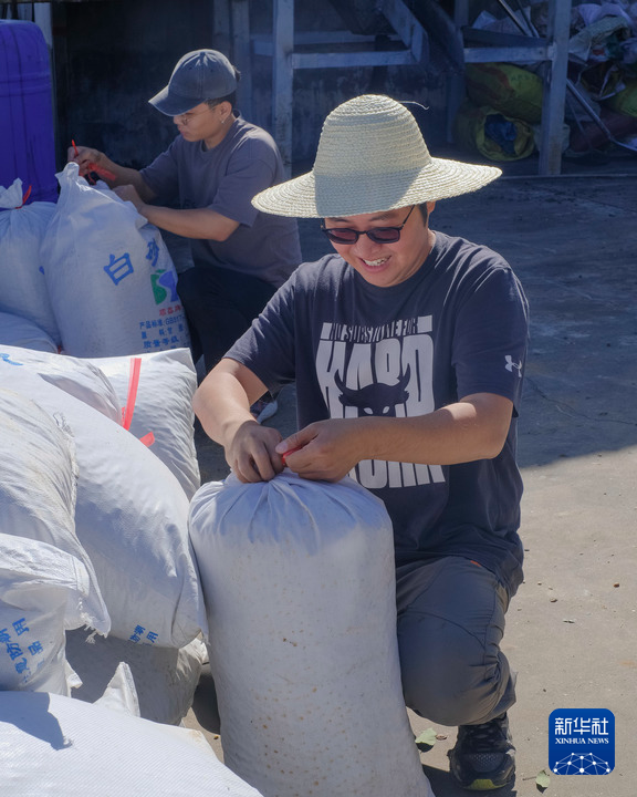 阿科(右)在云南省保山市潞江坝的有山咖啡庄园晾晒场和团队伙伴将咖啡生豆装袋(资料照片)。新华社发