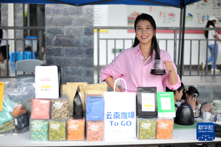 罗怡在普洱举办的咖啡市集上推荐自家生产的咖啡豆(资料照片)。新华社发