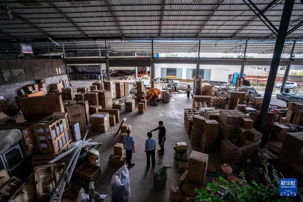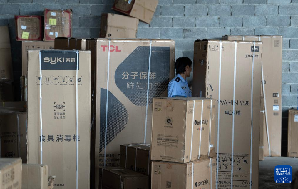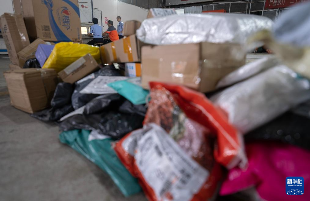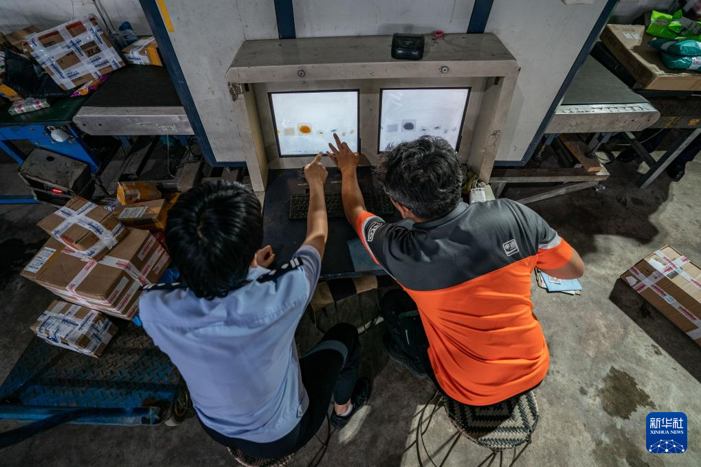 7月12日,尹铭燕(左)和同事在芒市一处物流点对快递包裹进行查缉。