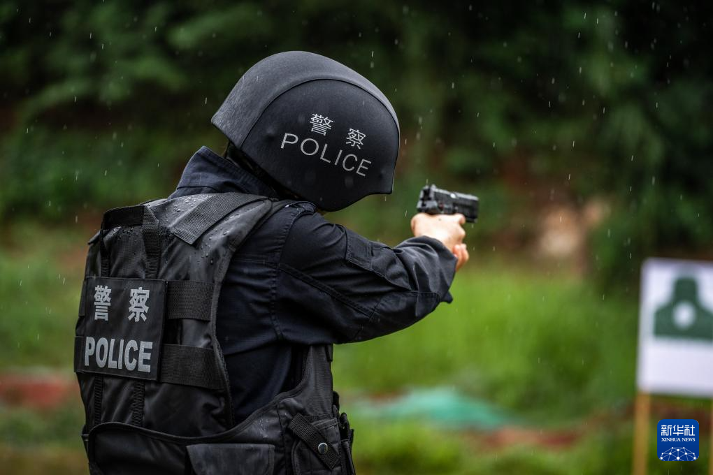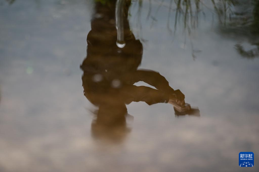 7月13日,尹铭燕在进行射击训练,地面的水洼映出她的倒影。