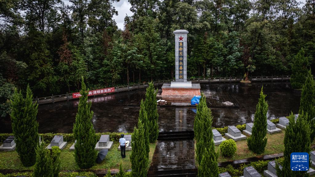 7月12日,尹铭燕在陇川县烈士陵园祭奠牺牲的哥哥尹铭志(无人机照片)。