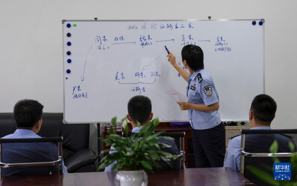 7月13日,尹铭燕(右二)和同事在模拟进行案情分析和推演。