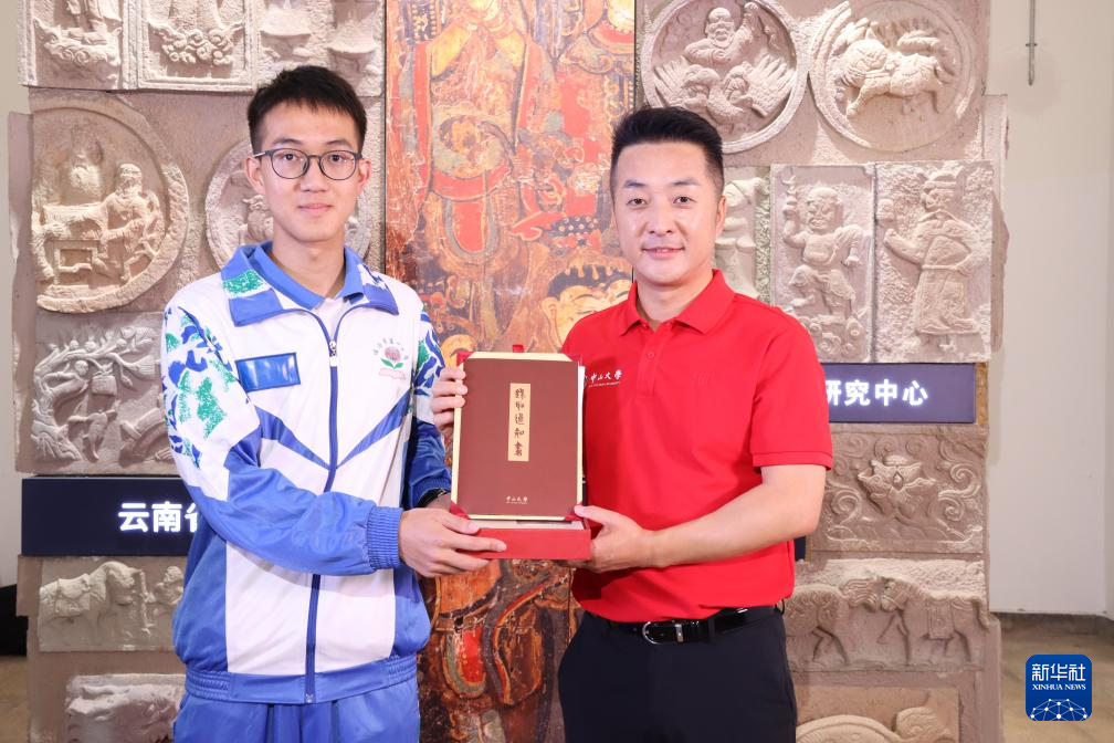 这是2023年中山大学全国第二封、云南首封录取通知书,由中山大学挂职干部、临沧市凤庆县副县长张哲亲手将其送到罗际航的手上。这个从小热爱中华传统文化的男孩,如今被中山大学中文系古文字学专业录取。
