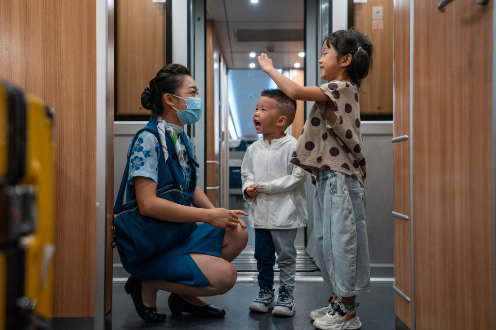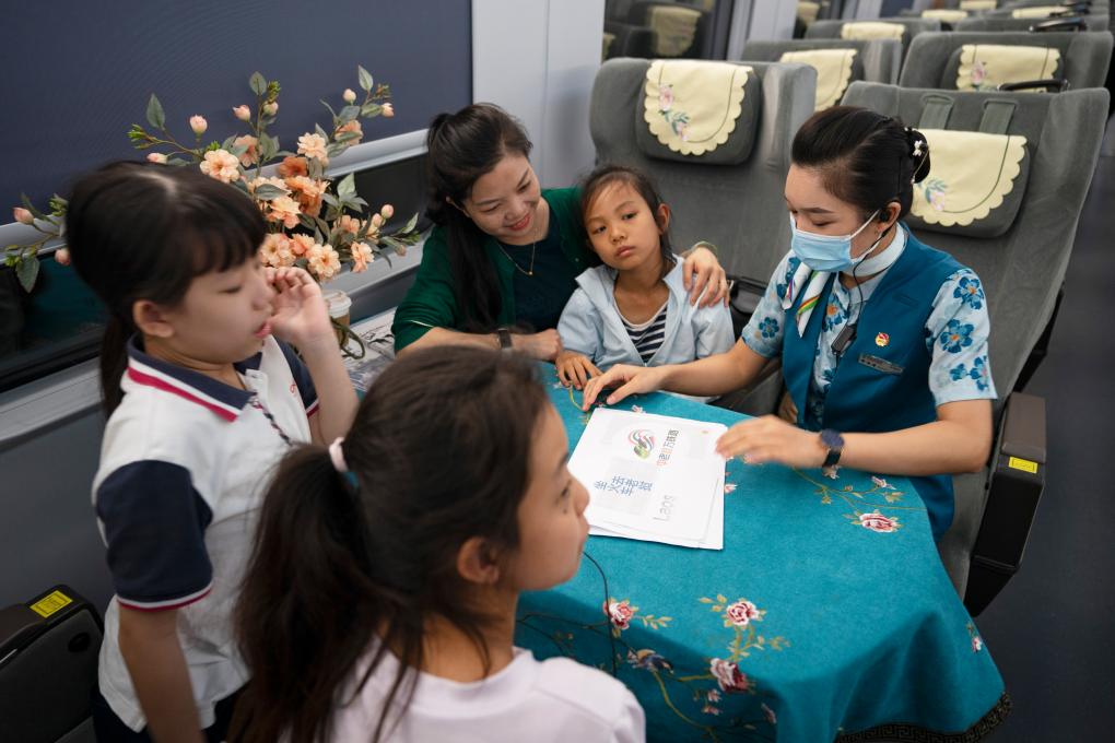 ↑依波逢(左一)在D887次列车上与小朋友互动(7月16日摄)。