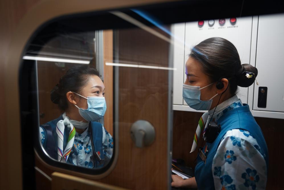 7点40分左右,乘客们开始陆续登车,依波逢站在站台,热情地招呼着乘客。隔着口罩,乘客也能感觉到她脸上绽放的笑容,这是一种从内心散发出来的喜悦。她喜欢这条铁路,喜欢在这条铁路上工作。因为,这条铁路把依波逢梦想中的远方和故乡连在了一起。