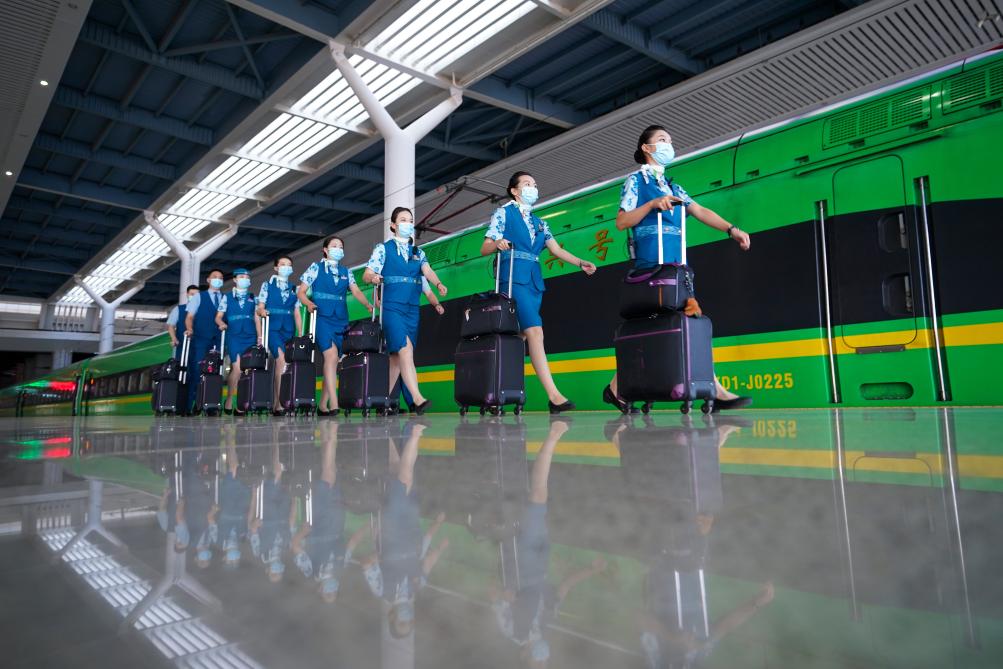 ↑依波逢(右一)和同事列队从D887次列车旁经过,准备登车开始工作(7月16日摄)。
