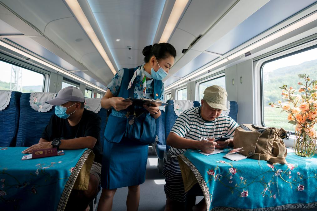↑依波逢(中)在D887次列车上协助出境旅客填写出境信息表(7月16日摄)。
