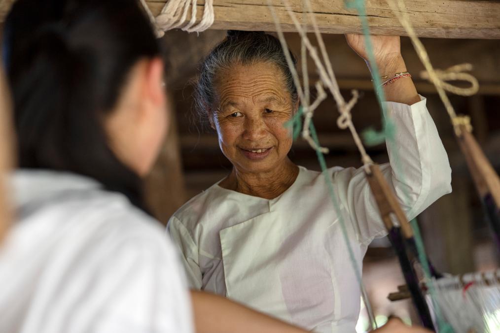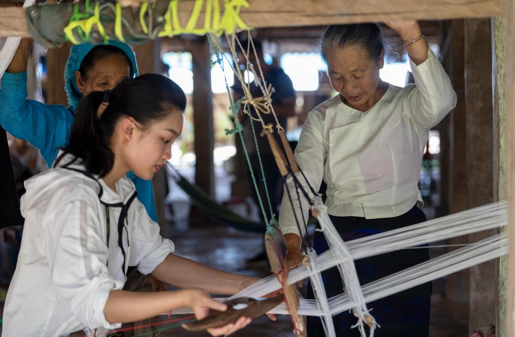 ↑7月16日,依波逢的外婆(右)指导依波逢织布。