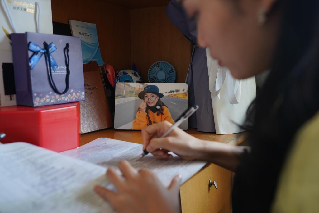↑依波逢在位于昆明的住处学习老挝语(7月15日摄)。