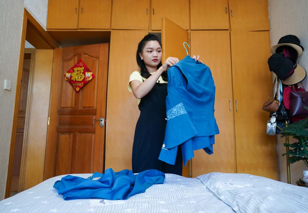 ↑依波逢在位于昆明的住处整理工作服(7月15日摄)。