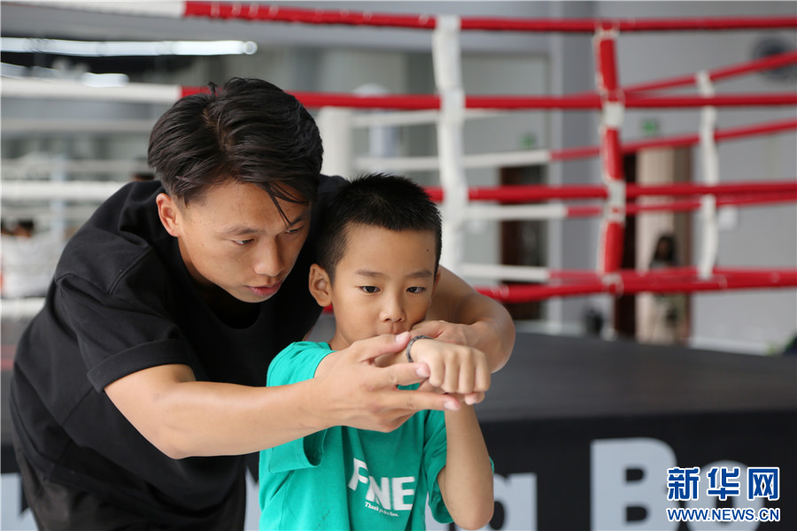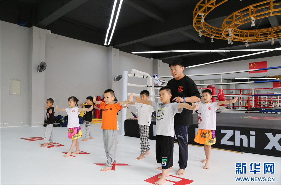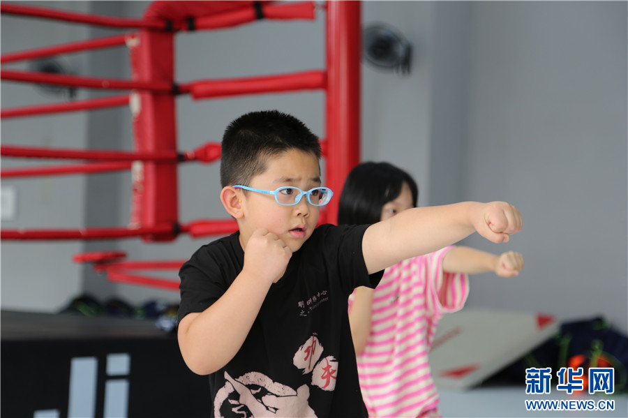 7月16日,孩子们在云南省红河州青少年宫搏击运动馆学习搏击。新华网发(薛莹莹 摄)