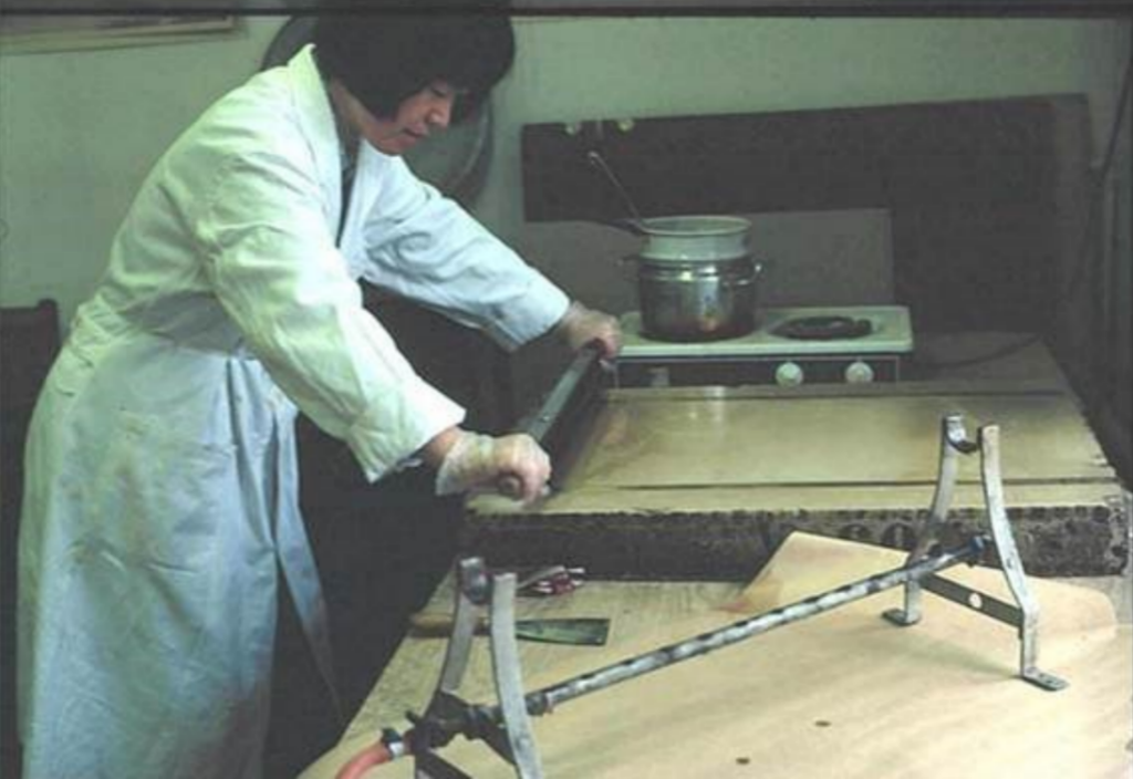 张弥曼正在制作等比例放大20倍的标本蜡质模型。(1981年摄于斯德哥尔摩)