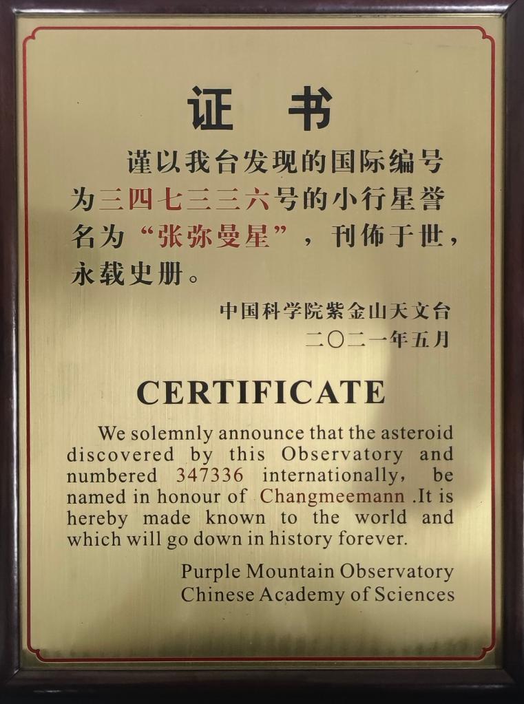 7月19日,“张弥曼星”命名仪式在云南曲靖举行。经国际小行星命名委员会批准,由中国科学院紫金山天文台发现、国际编号为347336号的小行星被正式命名为“张弥曼星”。