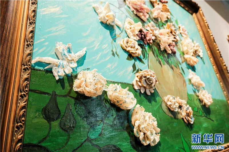 《向日葵》《玫瑰》《杏花》三幅画分别用鸡枞、白参、竹荪、猴头菇等野生菌制成