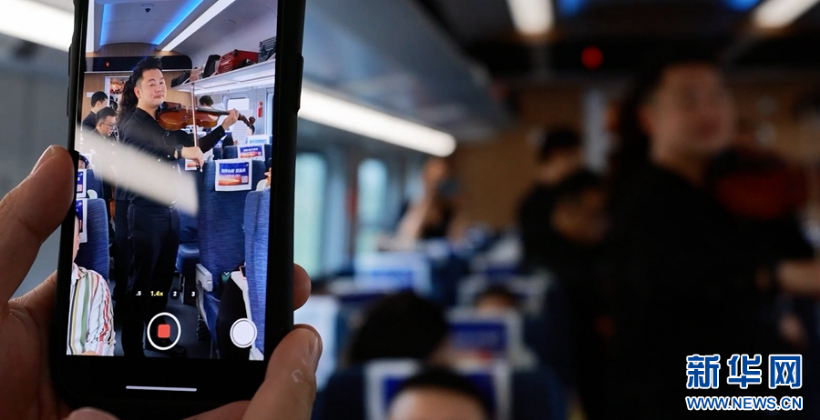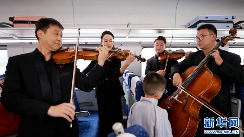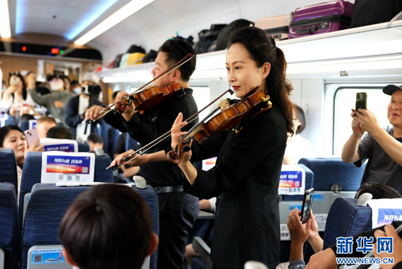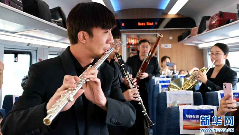 7月19日上午,来自昆明聂耳交响乐团的9名演奏家“闪现”中老铁路C303次列车4号车厢,倾情演奏了《在希望的田野上》《绒花》《唱支山歌给党听》等著名曲目,循声而来的乘客们纷纷跟着熟悉的旋律哼唱起来,车厢里歌乐相和,一片欢腾。