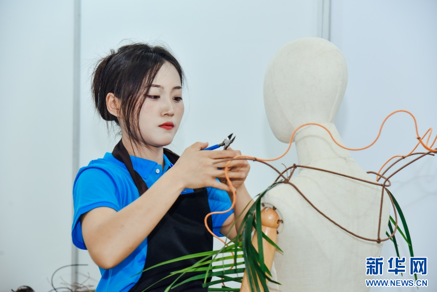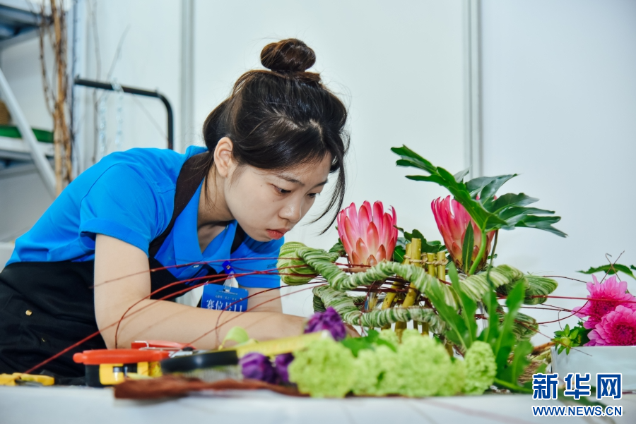 参赛选手制作花艺作品 (7月20日摄)。新华网发(云南林业职业技术学院供图)