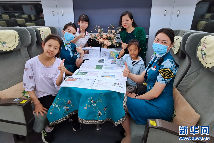 搭乘中老铁路国际旅客列车的乘客与乘务员合影留念(资料图)。新华网发(李娅娇 摄)