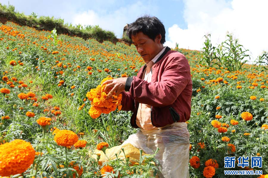 村民采摘万寿菊(7月24日摄)。新华网发(毛欢 摄)