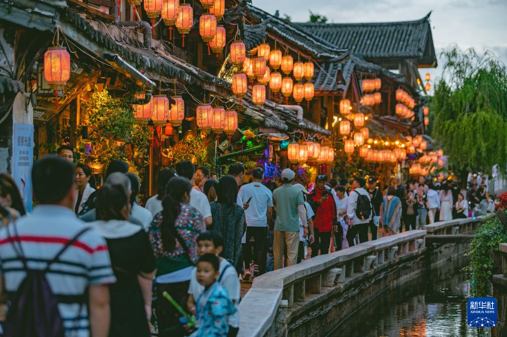 傍晚时分,游客在丽江古城旅游观光。(和珍浩 摄)