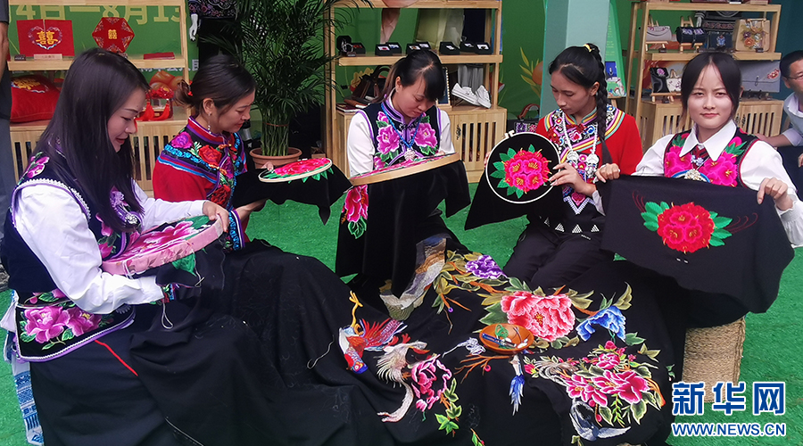 现场制作彝绣作品(7月29日摄)。新华网发(陈晓阳 摄)