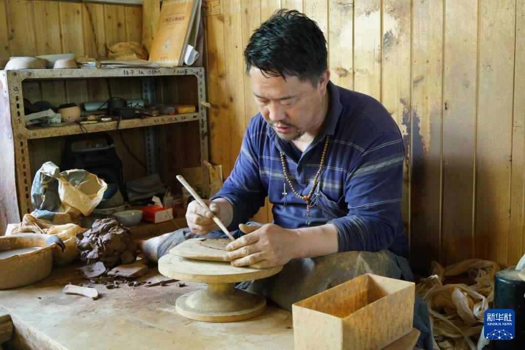 鲁茸恩主为游客演示制作黑陶。新华社记者 佟璐 摄