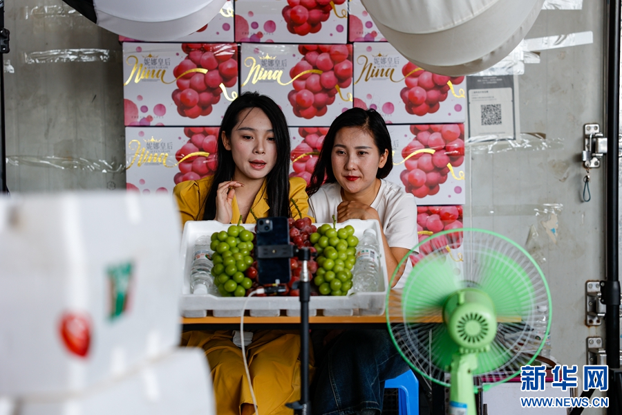 刘梦瑶(左)通过直播销售宾川葡萄(摄于7月10日)。新华网 赵普凡 摄