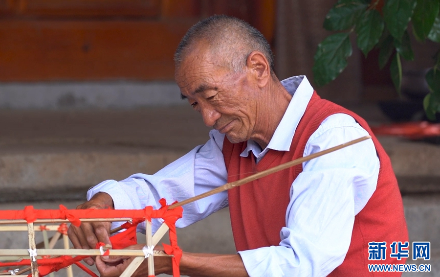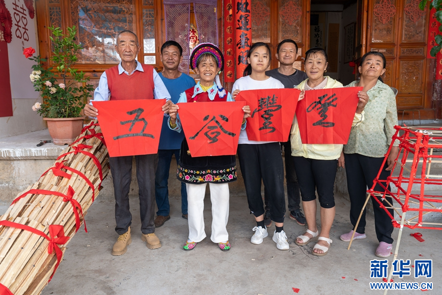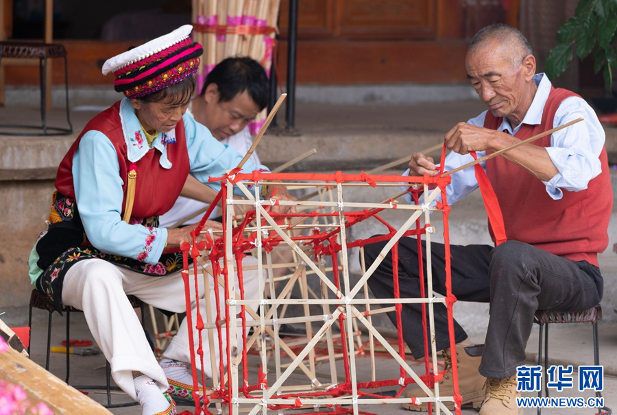 每年农历六月二十五是白族的火把节,村村寨寨都有竖火把的习俗。在杨飞梧扎制的火把中,最有特色的,是由13节组成的大火把。杨飞梧介绍,大火把通常是做12节,一节代表一个月,今年是闰二月,所以要做13节。主体部分完成后,还要再扎4层升斗,最后在火把顶端装饰上纸扎的“白鹤含松”,并在升斗上贴上“五谷丰登”“四季求财”“风调雨顺”等吉祥文字,一根大火把才宣告制作完成。工艺繁复、制作考究的火把,表达了白族群众对传统节庆的重视、对美好生活的向往。(李雪梅 杨润桃)