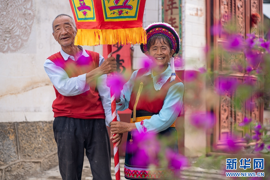 杨飞梧和老伴杨培花一起展示火把的升斗部分(摄于7月28日)。新华网发(罗新才 摄)
