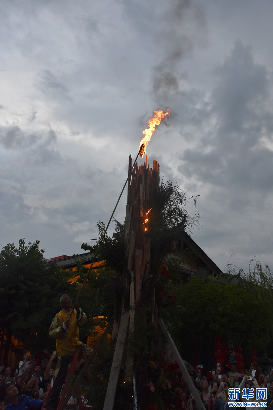 火把节现场点燃的5米高主火把(8月11日摄)。新华网发(陈俊佳 摄)