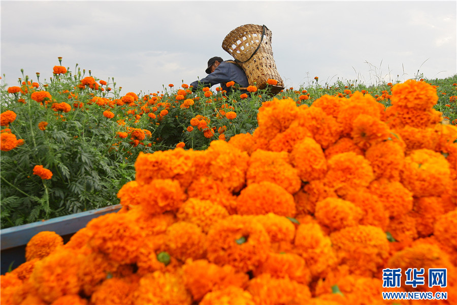8月13日,云南省曲靖市沾益区白水镇中心村,花农采摘万寿菊。