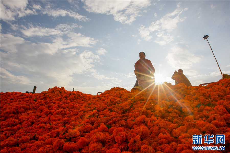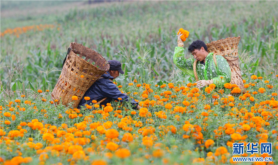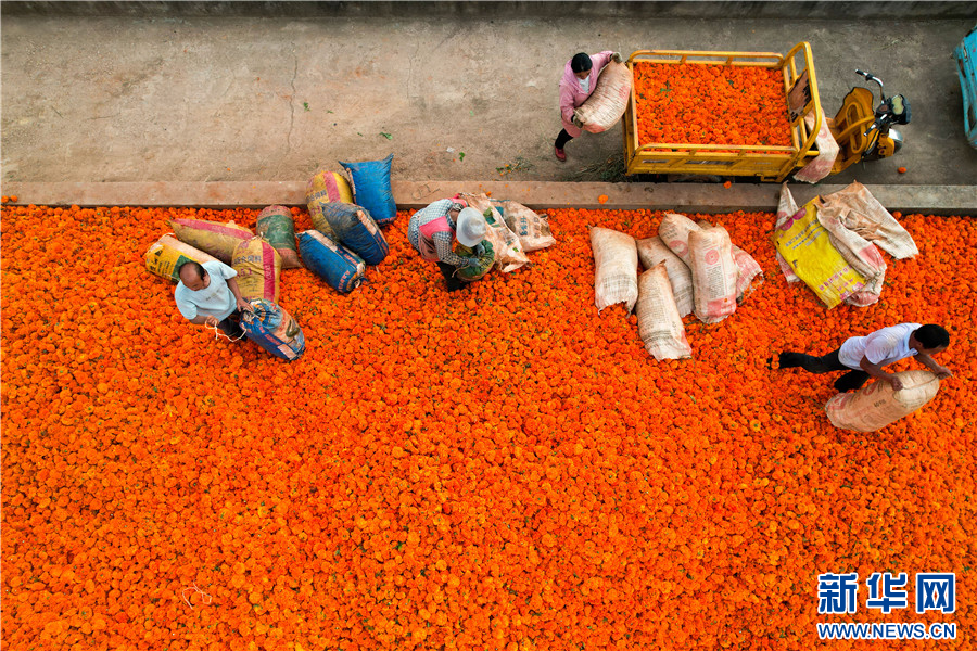 初秋时节,云南省曲靖市沾益区各地的水果、万寿菊等作物迎来丰收,农民忙着采收、搬运、分拣、包装、销售,呈现出一派喜人的丰收景象。新华网发(杨俊鹏摄影报道)