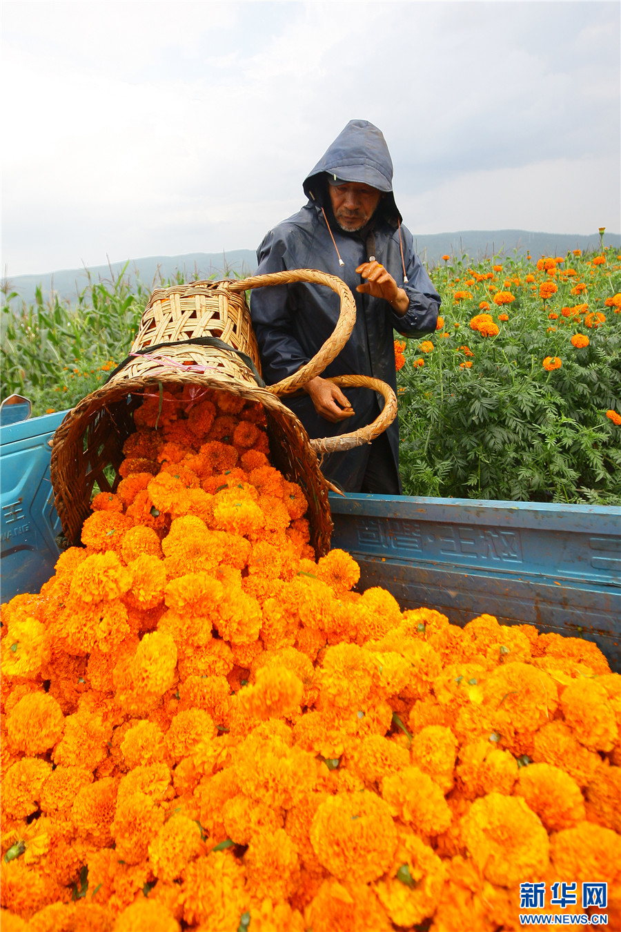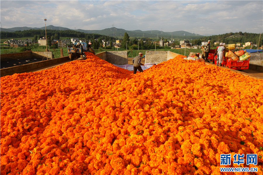 8月13日,云南省曲靖市沾益区白水镇中心村,花农将万寿菊倒入车箱。