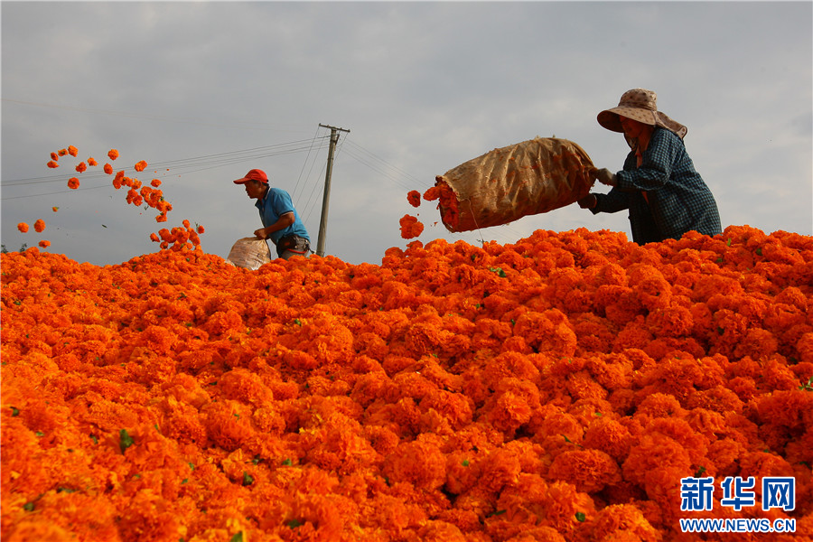 8月16日,云南省曲靖市沾益区大坡乡大坡村万寿菊收购点,花农将万寿菊倒入花池。