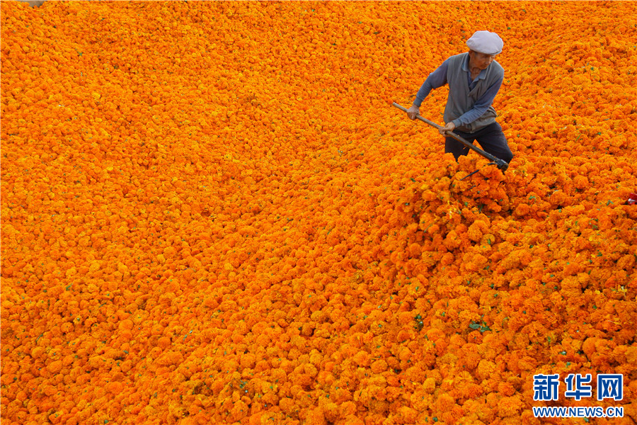 8月13日,云南省曲靖市沾益区白水镇勺达村万寿菊收购点,工作人员在花池内整理万寿菊。