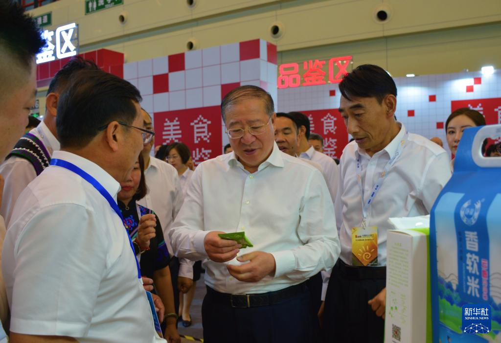 云南省粮食和物资储备局局长徐鹏声(右一)向国家粮食和物资储备局党组书记刘焕鑫(中)介绍高原特色粮油。