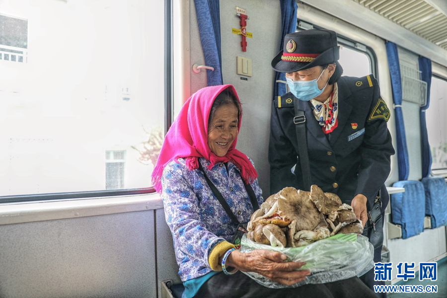 列车长跟一名熟识的“拾菌人”热络地聊了起来(摄于8月24日)。新华网发(杨紫轩 摄)