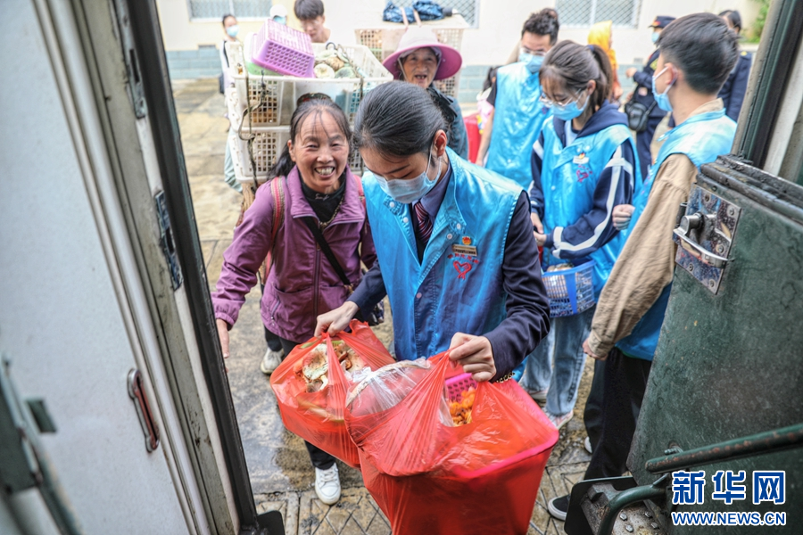 列车工作人员帮助农户将装满野生菌的筐子搬进车厢(摄于8月24日)。新华网发(杨紫轩 摄)