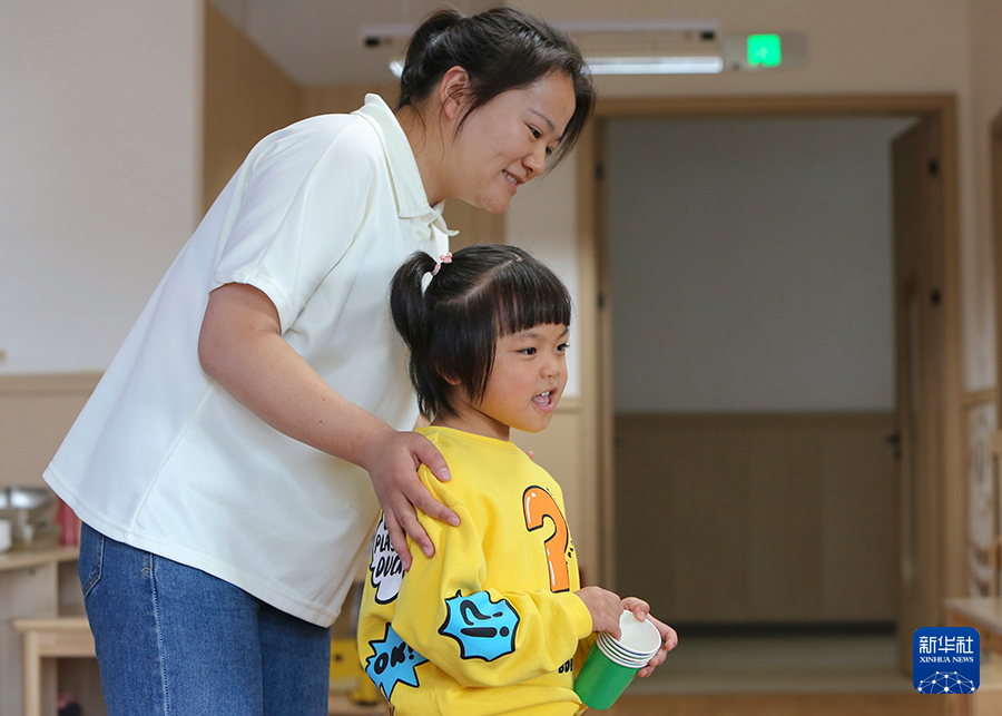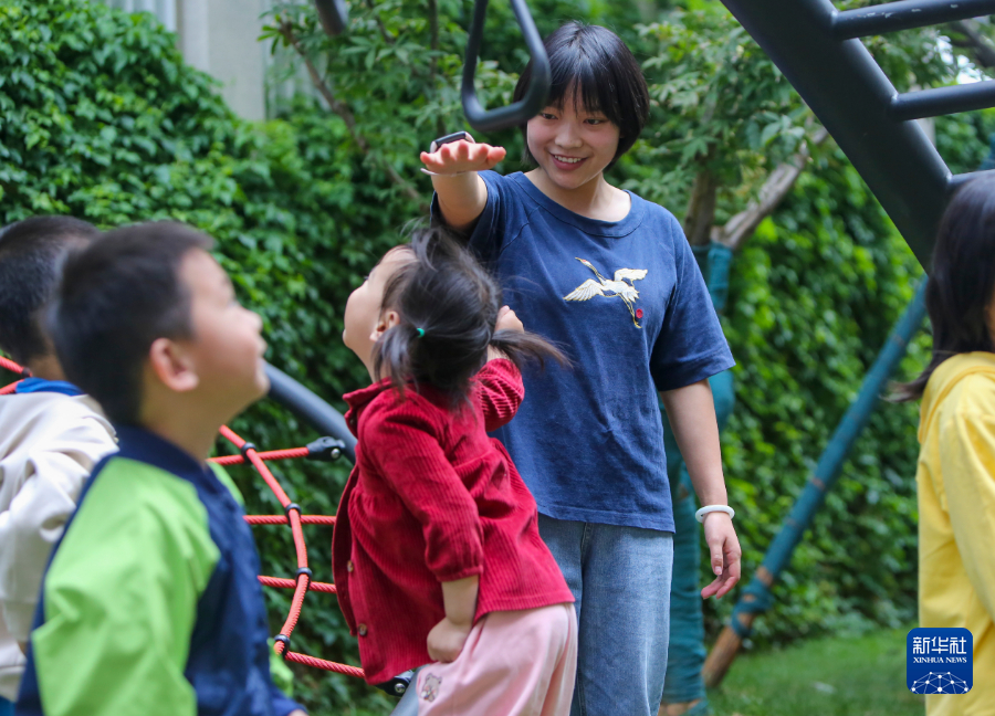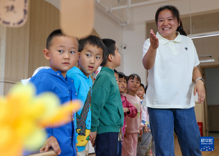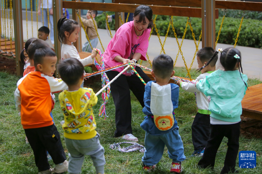 在云南省昆明市西山区前卫幼儿园,老师在和小朋友们做游戏(9月6日摄)。新华社记者 崔文 摄