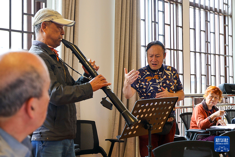 在云南老年大学的电吹管课上,老师(右二)在为学生打节拍(9月7日摄)。新华社记者 崔文 摄